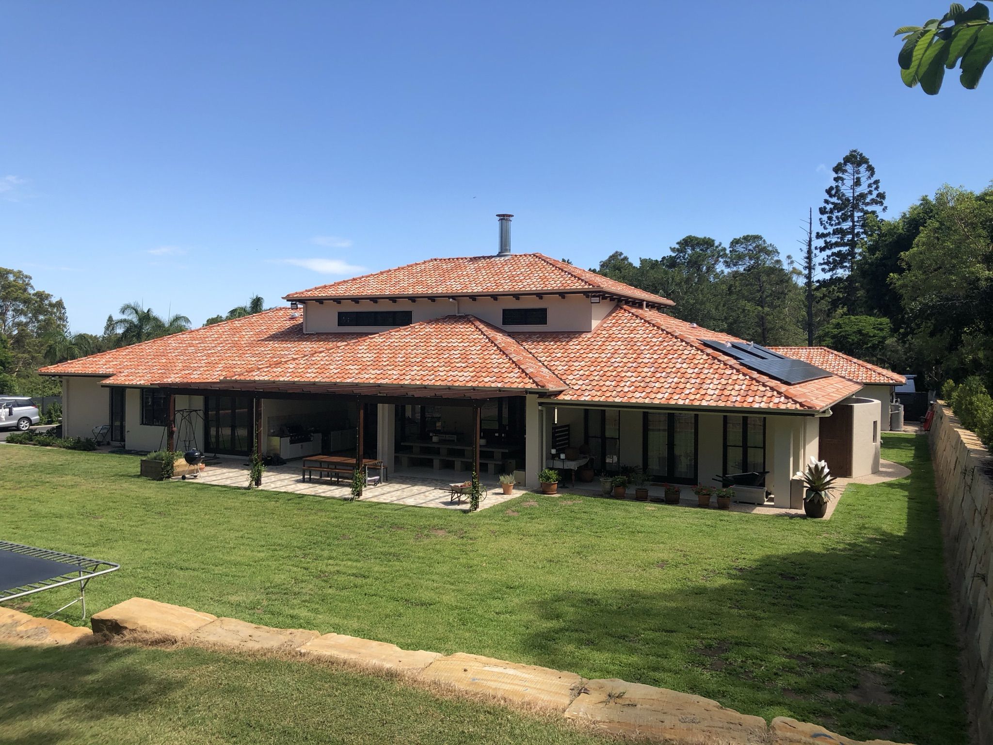 The original block had a slope of gradient 1:10 which was leveled and retained to suit the 890m2 single level house, complete with courtyard area and minimum 3 living zones to accommodate a family of 5.